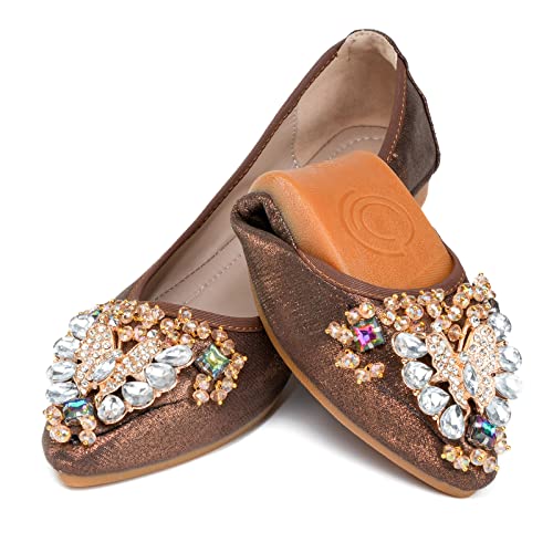 Brown Flats Shoes Women Bow Rhinestone Wedding Ballerina Shoes Comfort Slip on Sparkly Foldable Ballet Flats for Women Size 8.5