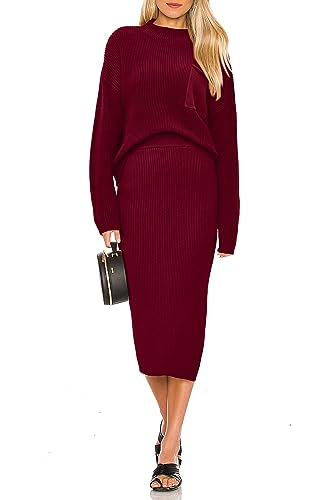 PRETTYGARDEN Womens 2023 Fall Two Piece Outfits Ribbed Knit Long Sleeve Pullover Sweater And Bodycon Midi Skirt Sets (Wine Red,Medium)