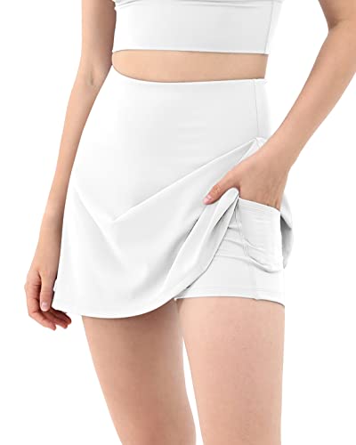 ODODOS Women’s High Waisted Tennis Skirts with Pockets Built-in Shorts Golf Skorts for Athletic Sports Running Gym Training, White, Small