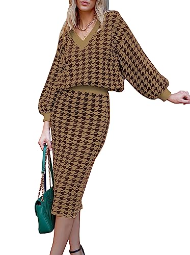 Pink Queen Women’s 2 Piece Outfit Dressy Long Sleeve Top Bodycon Skirt Sets Knit Houndstooth Midi Sweater Dress Brown M