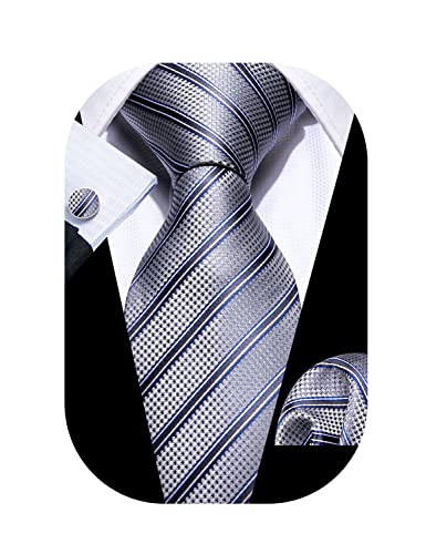 Barry.Wang Stripe Men Ties Set Classic WOVEN Necktie with Handkerchief Cufflinks Formal (Gray Blue White Stripe)