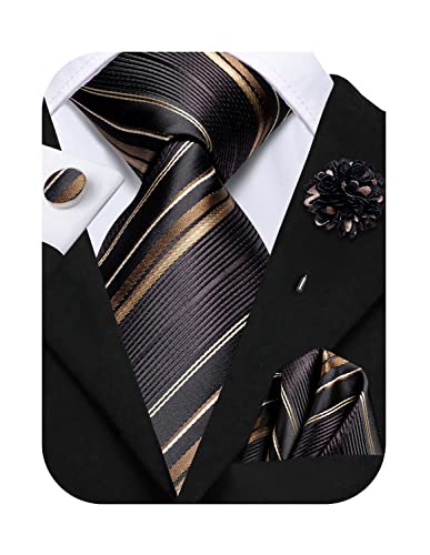 Hi-Tie Black Gold Stripe Men’s Tie Lapel Pin Set Formal Necktie Handkerchief Cufflinks Set For Wedding Groosmen Party