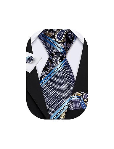 Barry.Wang Mens Tie Set Blue Black White Paisley Neckties Wedding Formal Business Striped Handkerchief Cufflinks