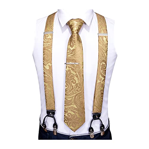 Barry.Wang Men Suspender Set with Necktie Elastic Y Type Heavy Duty 6 Clips Braces Designer Gift (Paisley Gold Flower)