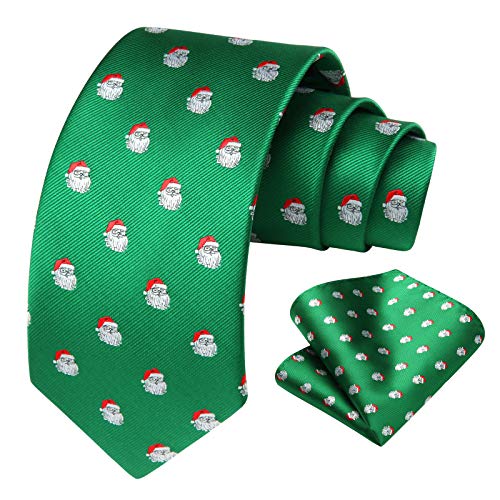 HISDERN Christmas Mens Ties Green Xmas Tie and Pocket Square Holiday Season Santa Funny Neckties Handkerchief for Party with Gift Box