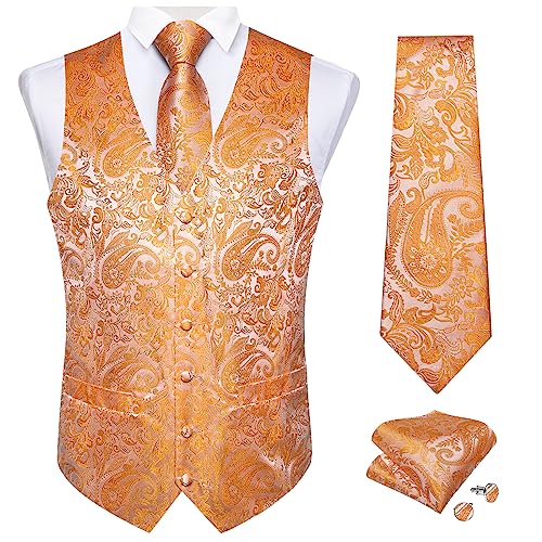DiBanGu Orange Mens Suit Vest Set with Necktie Pocket Square Cufflinks Formal Vest and Tie Set Paisley Silk Vest for Tuxedo Prom S