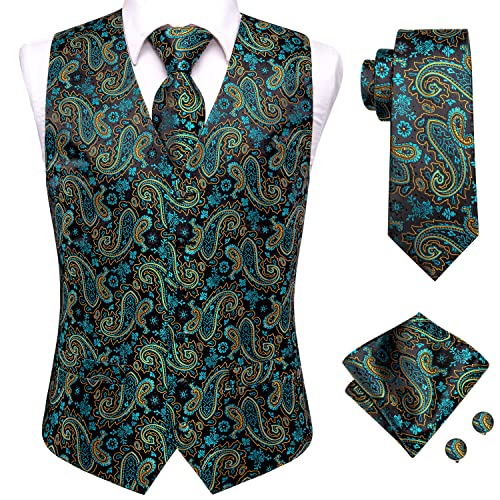 Hi-Tie Men’s 4PC Teal Gold Suit Vest Tie for Business Party Silk Waistcoat Necktie and Pocket Square Cufflinks Set for Prom Wedding