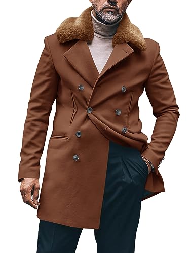 PASLTER Mens Double Breasted Trench Coat Detachable Faux Fur Collar Pea Coat Slim Fit Notched Lapel Winter Business Overcoat