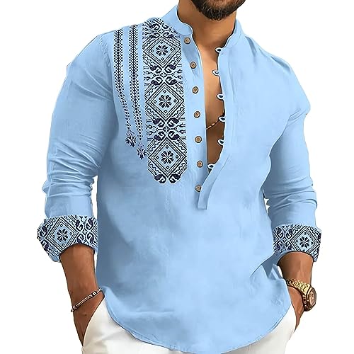 Blue Geometry L 2024 Linen Shirts for Men Henley Long Sleeve Casual Banded Collar Button Vintage Beach Hawaiian T Shirt
