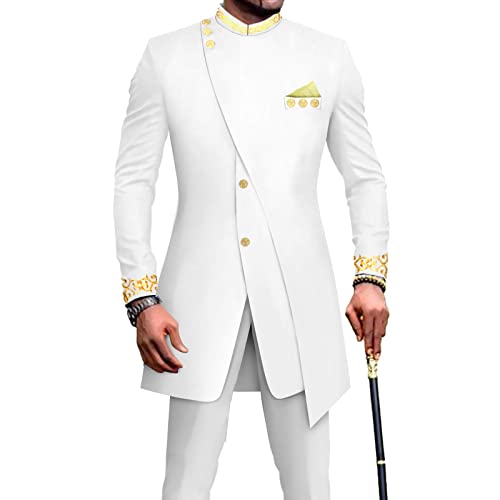 African Suits for Men Slim Fit Embroidery Blazer and Pants Set Business Dress Suit Party Wedding Evening White XX-Large