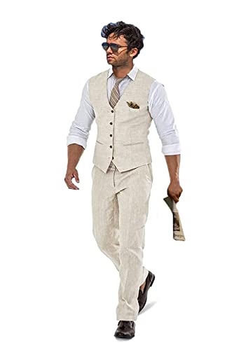 Beige Linen Beach Wedding Suits Men’s Slim Fit 2 Piece Groom Suit Prom Party Dress Tuxedos Vest Pants Suit Set-S