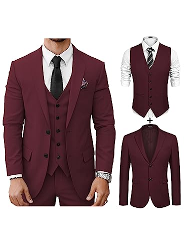 COOFANDY Men’s Slim Fit 2 Piece Suit Two Button Solid Business Wedding Prom Tuxedo Blazer Vest Set Wine Red