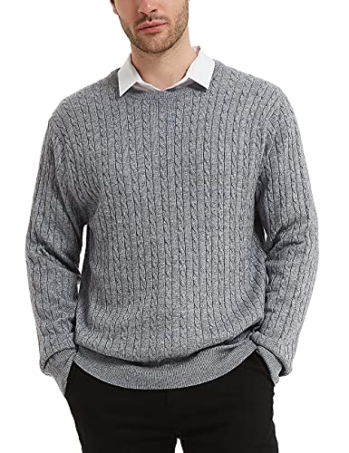 Kallspin Men’s Cable Knit Crewneck Sweater Pullovers Wool Blended Relax Fit Knitwear (Light Grey, Large)