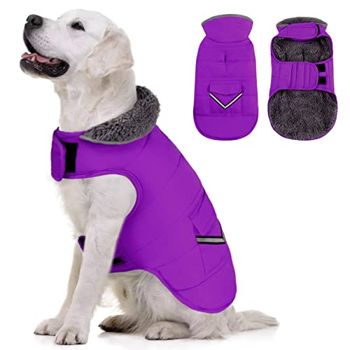 MIGOHI Warm Dog Coat, Winter Dog Jacket for Cold Weather, Reflective Windproof Dog Fleece Vest Thick Dog Apparel with Leash Hole and Furry Collar for Puppy Small Medium Large Dogs, Purple L