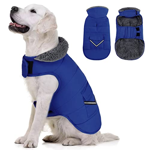 MIGOHI Warm Dog Coat, Winter Dog Jacket for Cold Weather, Reflective Windproof Dog Fleece Vest Thick Dog Apparel with Leash Hole and Furry Collar for Puppy Small Medium Large Dogs, Blue S