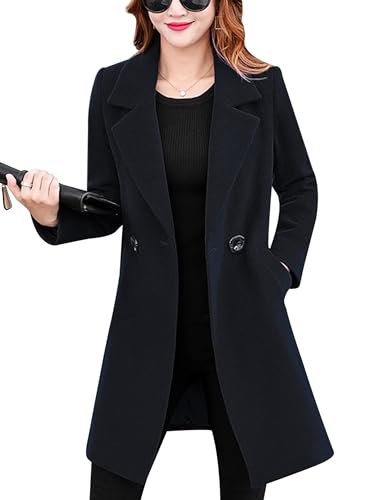 Tanming Womens Elegant Notched Collar Button Wool Blend Solid Long Pea Coat Overcoat (Black-S)