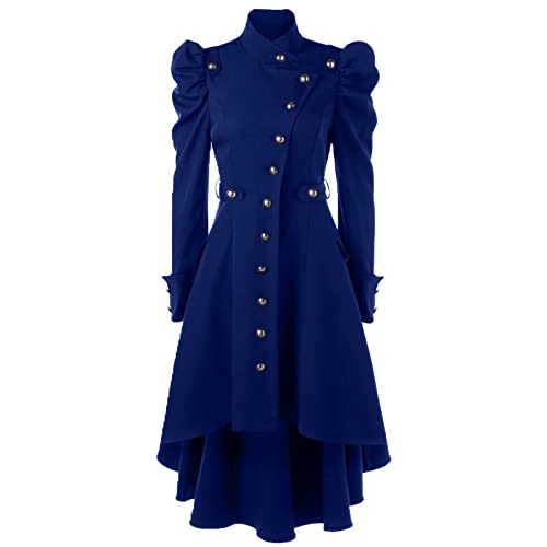 Womens Trench Coat Long Puff Sleeve Tops Irregular Gothic Buttons Tailcoat Jackets Overcoat Vintage Windbreaker Coat Blue
