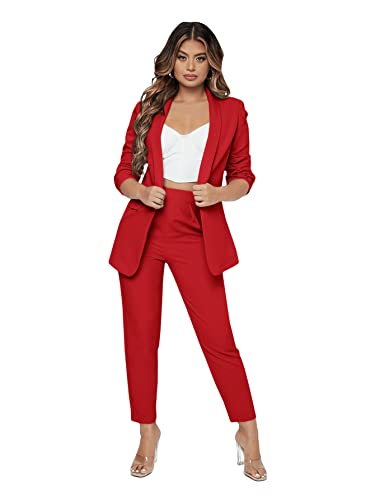 SweatyRocks Women’s 2 Piece Solid Ruched Sleeve Blazer and Pants Business Office Suit Set Red L