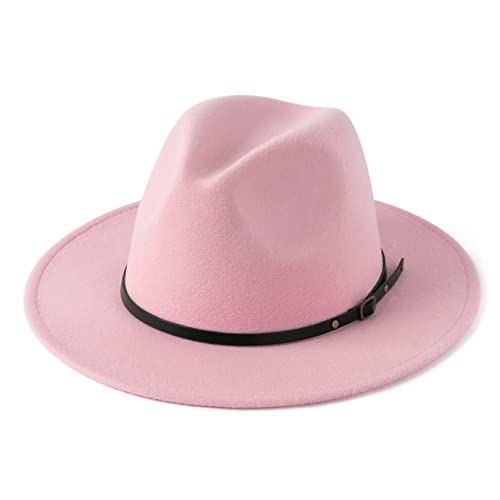 HUDANHUWEI Women’s Classic Wide Brim Fedora Hat with Belt Buckle Felt Panama Hat Pink