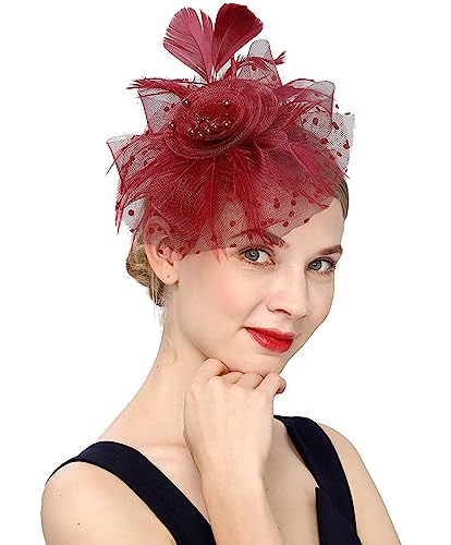 Umturmok Women’s Tea Party Fascinators Mesh Flower-Shaped Pearl Feather Veil Kentucky Derby Fascinator Hats with Headband and Clip Wine Red