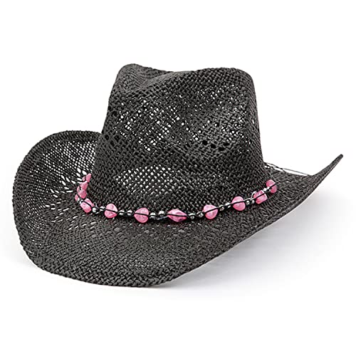 TOVOSO Western Cowgirl Hat, Straw Cowboy Hat for Women with Shapeable Brim, Beaded Hearts Trim, Shapeable Cowboy Hat, Black-Pink