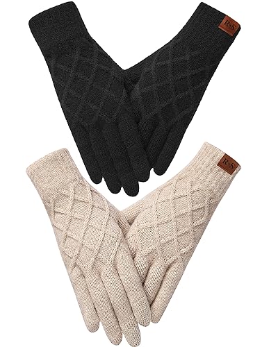 REACH STAR Winter gloves for women Touch screen Cashmere Elastic Thermal knit Lining Warm Gloves for Cold weather,Running,Driving(Black+Khaki)